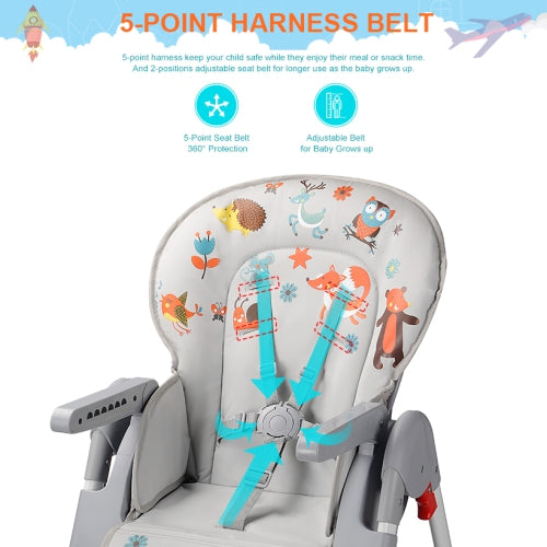 Designed to adapt from 7–36 months with 6 seat heights, 3 reclining positions, 3 tray adjustments, and 3 footrest levels. -