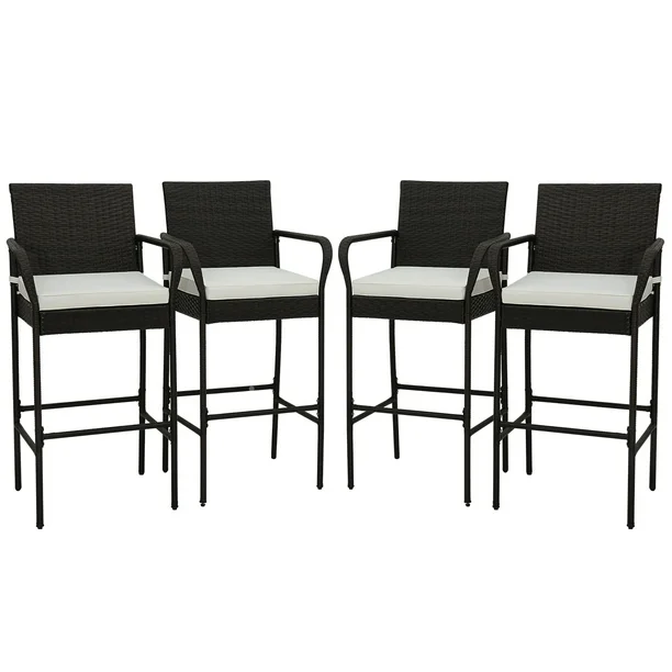 Gymax 4PCS Patio PE Wicker Bar Chairs Counter Height Barstools With Armrests & Cushions