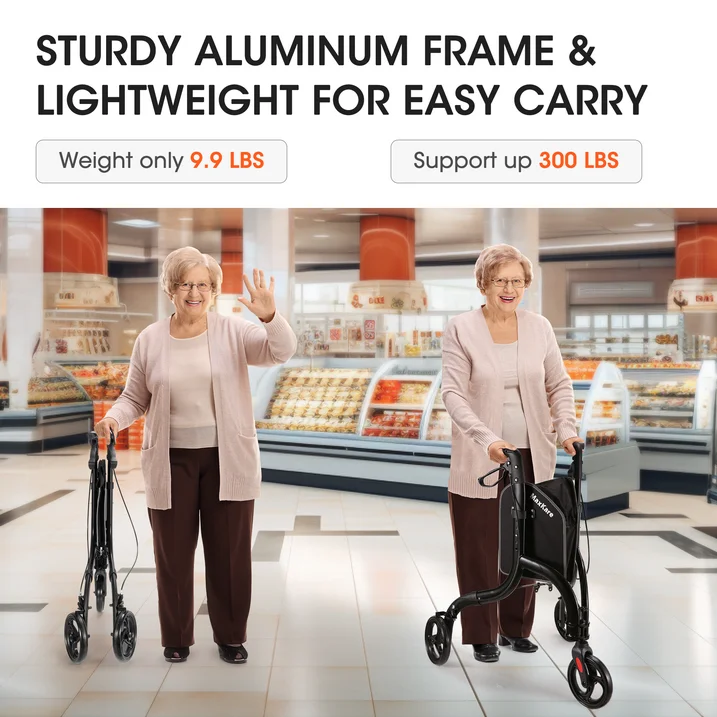 MaxKare 3-Wheel Walker for Seniors Foldable Rollator Walker with 8'' Wheel Lightweight, 300Lbs Weight Capacity, Height Adjustable, Black